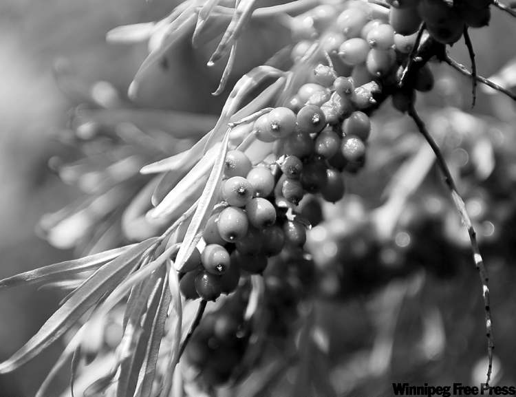 The problem with sea buckthorn is the shrubs protect their berries with thorns that are five centimetres long. The berries are also firmly attached to the plant. Manitoba growers have been cutting branches, freezing them, then shaking off the berries.