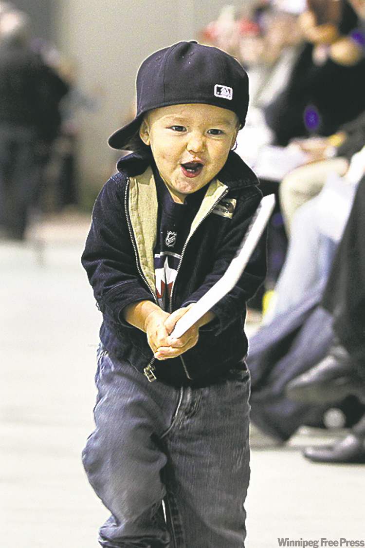 Just a few panels of glass away, Kevin Storimans is holding up his young son, Trevor, to get a better look at Winnipeg’s new Jets.