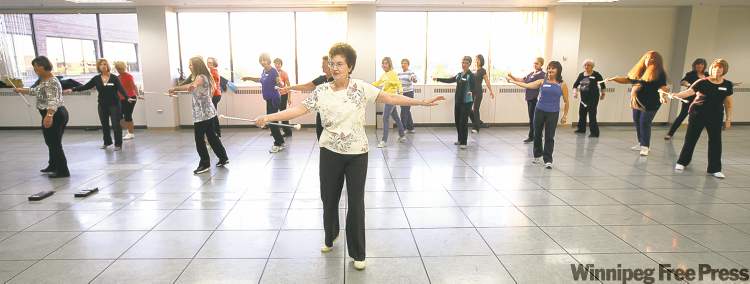 “God, we’re good,” Linda Peter Boughton joked as Fiala led 23 of the former cheerleaders in a two-step while they simultaneously twirled batons at a recent practice.