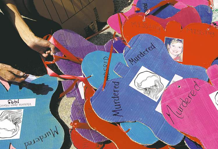 MIKE DEAL / WINNIPEG FREE PRESS Someone grabs one of the many signs bearing the names of missing or murdered women.