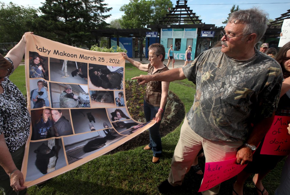 Rene Dubois points to a photo quilt his family made of Makoon's stay with him after the black bear cub found in a ditch near St Malo. Protestors gathered in front of the Assiniboine Park Zoo Wednesday to protest the province's handling of Makoon.