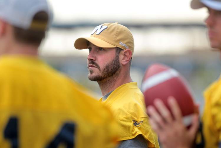 Winnipeg Blue Bomber QB Buck Pierce during practice at Canad Inns Stadium Tuesday.
