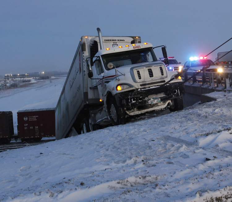 A semi-trailer heading southbound on the east Perimeter slid off the roadway near the overpass just north of Gunn Road, just after 5 a.m. this morning, went down the embankment, down and through a ditch, across a field and then ended up on the CPR tracks.