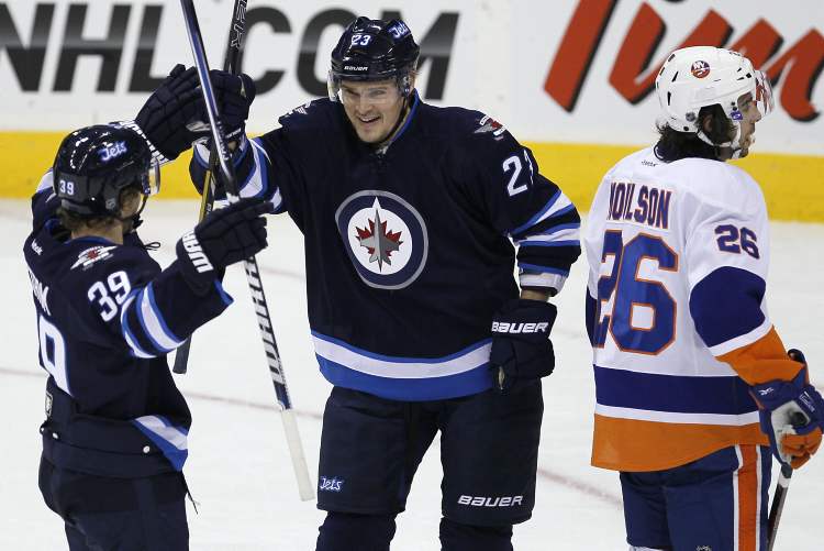❚ Inside the last 7:01, the Jets found a way back from two goals down, just like they did against Pittsburgh on Friday. Dustin Byfuglien rang in a power-play goal off the post and Alex Burmistrov clicked for his first of the season with 5:56 to play to send it to extra time.