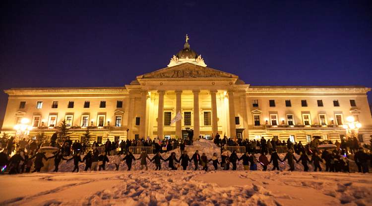 Drummers pounded out a 2/4 rhythm as Sainte-Marie’s voice bounced off the stone walls and carried down the legislature steps to a Glow Stick-waving crowd comprised of Cree, Anishinabe, Métis and non-aboriginal participants, most of them Winnipeggers but also some who made the trek from the east-side Lake Winnipeg communities of Hollow Water First Nation and Bloodvein First Nation.