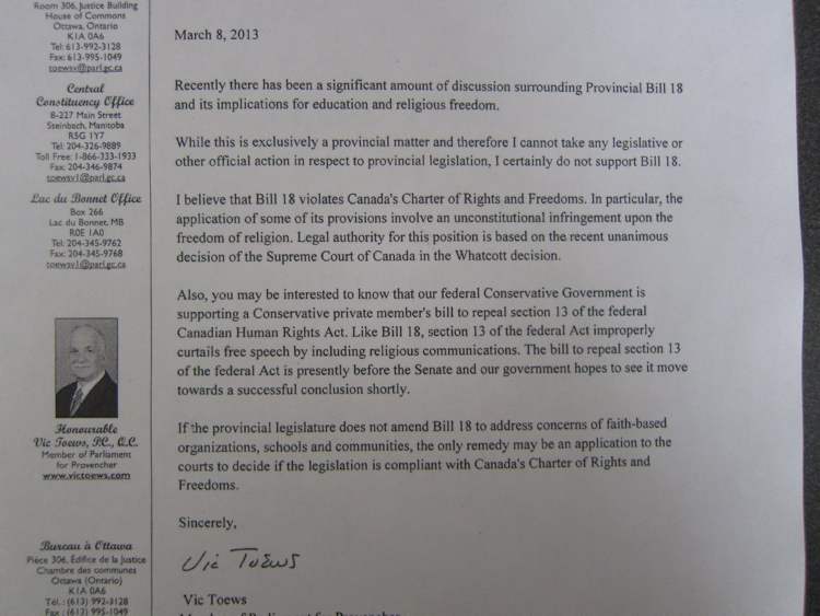 Toews said in the letter while as a federal minister he can’t take any legislative or other action on Bill 18, he does not support it because in infringes on freedom of religion.