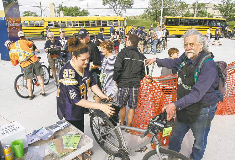 “We’ve been practising the big bike adventure — they were looking forward to it as much as the game,” said Ryan Kastes, who biked to the stadium from St. Vital with his son, Kade Kastes, and Kade’s friend, Peyton Allard. “So long as the weather is nice, we’ll definitely do this again.”