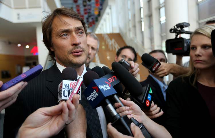 Teemu Selanne, who says he considered Baizley his 'Canadian dad,' speaks with news media at the MTS Centre service.