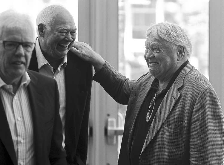 Ulf Nilsson, Ab McDonald and Bobby Hull (from left), teammates on the original Jets, share some humour as they arrive at the Don Baizley memorial service.