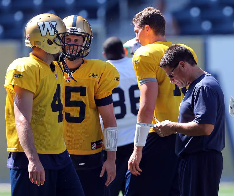 Offensive co-ordinator Marcel Bellefeuille (right) will have Max Hall (centre) as his starter when the Blue Bombers travel to Guelph, Ont., for Saturday's game.