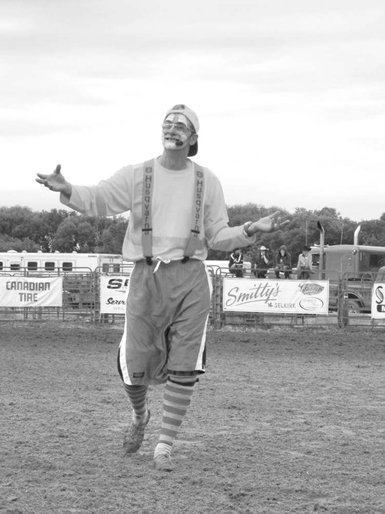 The clown is a crucial feature at rodeo, filling in lulls and unscheduled delays. “When it comes to filling in dead spots and getting the crowd going, there probably isn’t a better guy out there than Gord,” said Manitoba rodeo announcer and livestock auctioneer Ward Cutler.