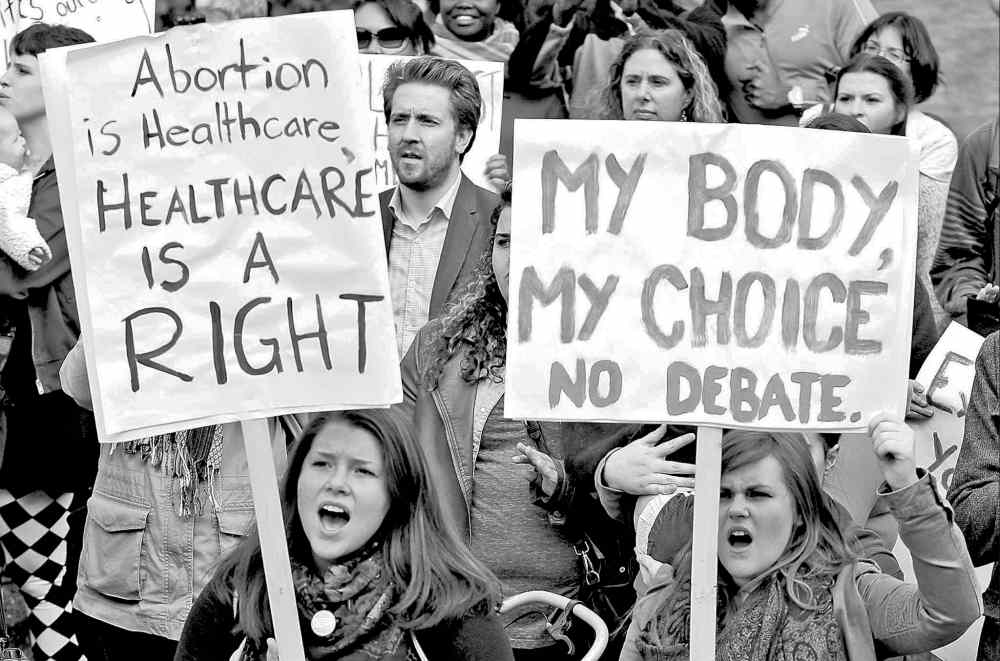 Both sides held up placards, which ranged from the predictable call for a woman’s right to choose to more provocative lyrics such as “Keep your rosaries off my ovaries.”
