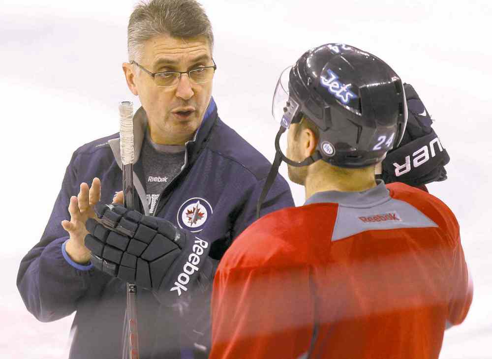 Winnipeg Jets head coach Claude Noel has some words of wisdom for defenceman Grant Clitsome at practice.