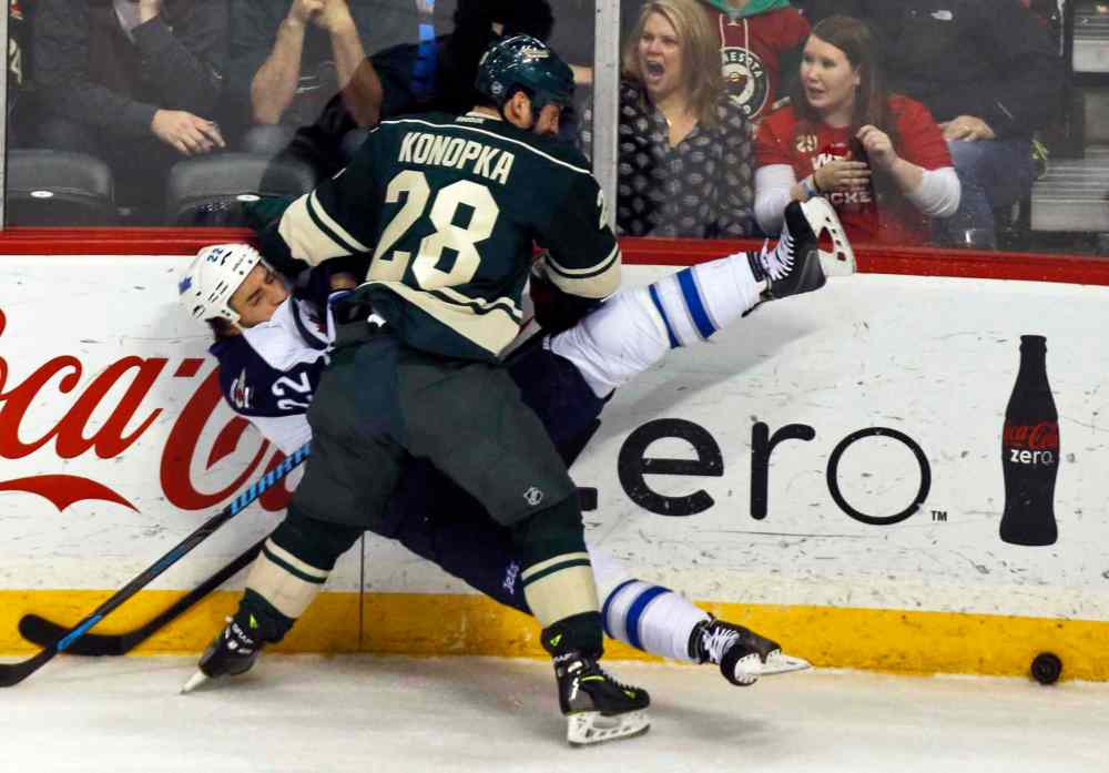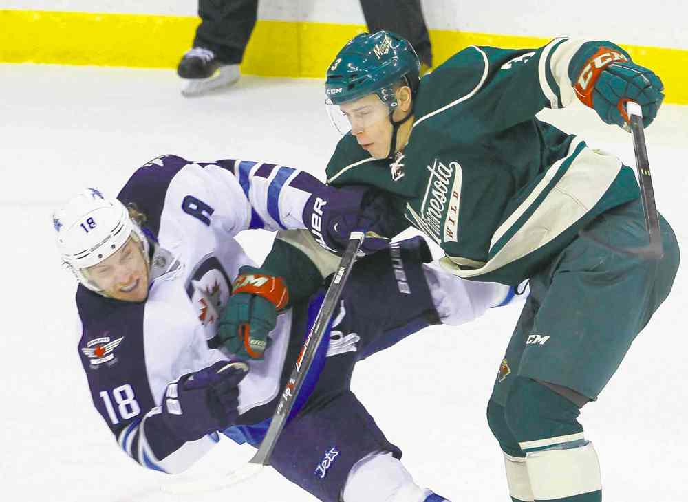 CP ann hesienfelt / the associated press Jets centre Bryan Little takes a hit from Minnesota Wild centre Charlie Coyle in the first period of Sunday�s 2-1 Wild win in St. Paul.