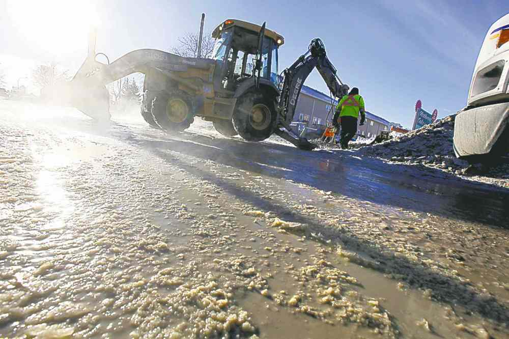 Water gushed from the broken main on Tuesday and turned the parking lot into a pond about 25 centimetres deep. With a temperature of -30 C, the vehicles quickly froze in solid ice that is about halfway up the tires on some vehicles.