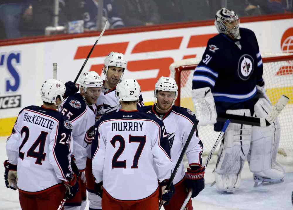 Columbus Blue Jackets' Derek MacKenzie (24), Mark Letestu (55), RJ Umberger (18), Ryan Murray (27) and James Wisniewski (21) celebrate after Letestu's third-period goal on Winnipeg Jets' goaltender Ondrej Pavelec (31) in Winnipeg Saturday.