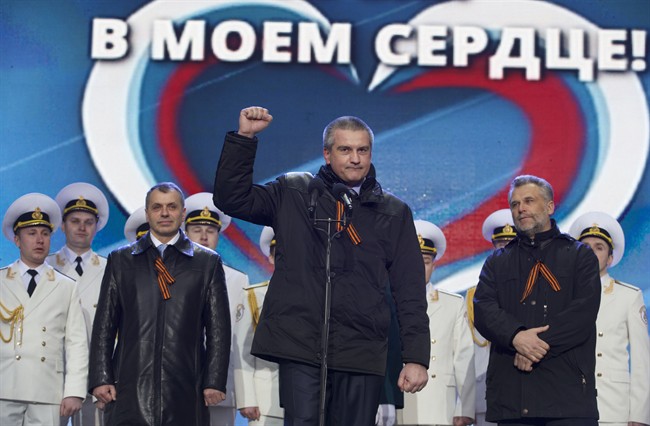 Crimean leaders, from left, Speaker of Crimean legislature Vladimir Konstantinov, Crimean Premier Sergei Aksyonov and Sevastopol mayor Alexei Chalyi, wearing ribbons symbolizing the Soviet victory in WWII, attend a rally in support of Crimea joining Russia in Red Square in Moscow, Tuesday, March 18, 2014. With a sweep of his pen, President Vladimir Putin added Crimea to the map of Russia on Tuesday, describing the move as correcting past injustice and responding to what he called Western encroachment upon Russia's vital interests. The sign in the back says