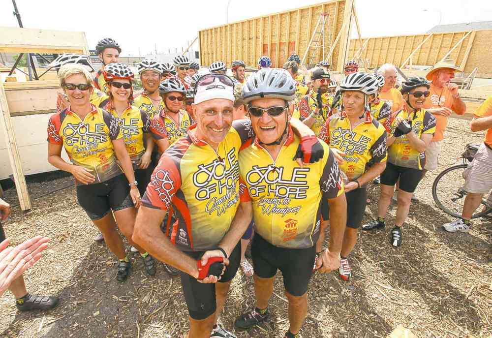 The Habitat for Humanity Cycle of Hope (COH) riders returned from their round trip to Omaha, Neb., Saturday afternoon, arriving at the home’s build site on Nairn Avenue with a Winnipeg police escort and to an exuberant greeting from a crowd of about 100 family, friends and volunteer builders.