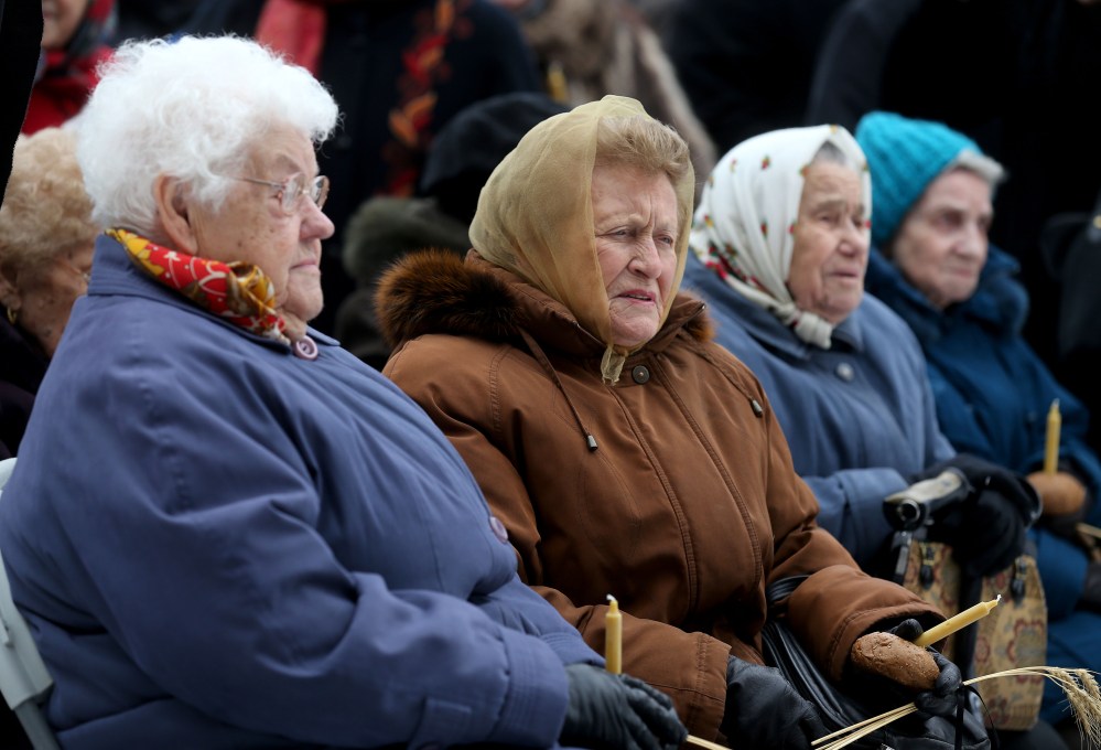 Survivors of the Ukrainian Holomodor at a service in front of city hall on Saturday.
