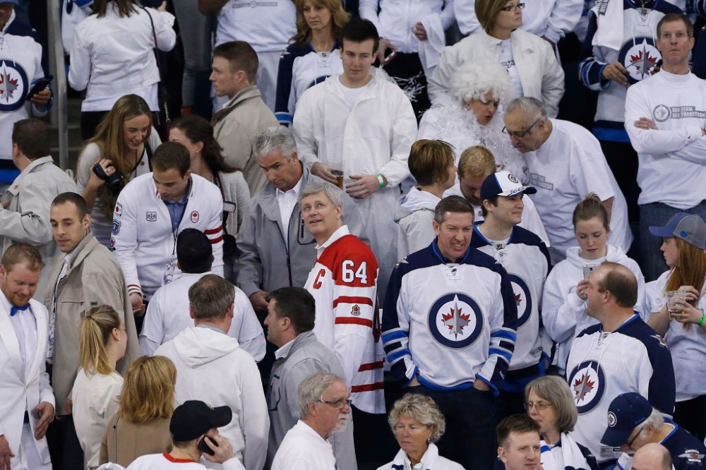 There is something unsettling about how easily politicians can use such events to fish for votes. Harper paid for his own ticket — no Manitoba NDP Jets’ tickets scandal for him, thank you very much — but he changed his schedule to make it happen. He was supposed to be in Winnipeg today to attend the 30th anniversary celebration tonight of the Canadian Centre for Child Protection. But then someone — either he or one of his strategists — saw the political opportunity of the Jets’ playoff game.