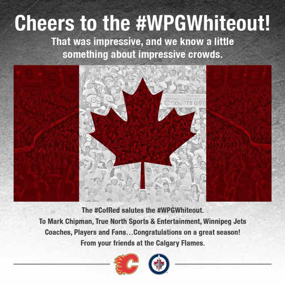 “To Mark Chipman, True North Sports & Entertainment, Winnipeg Jets Coaches, Players and Fans….Congratulations on a great season. From your friends at the Calgary Flames.”
