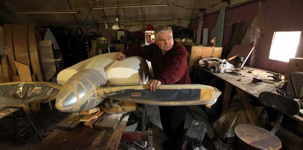 Bob Diemert leans on an engine fuselage for a WIG aircraft he and partner Chris Ball  are developing.