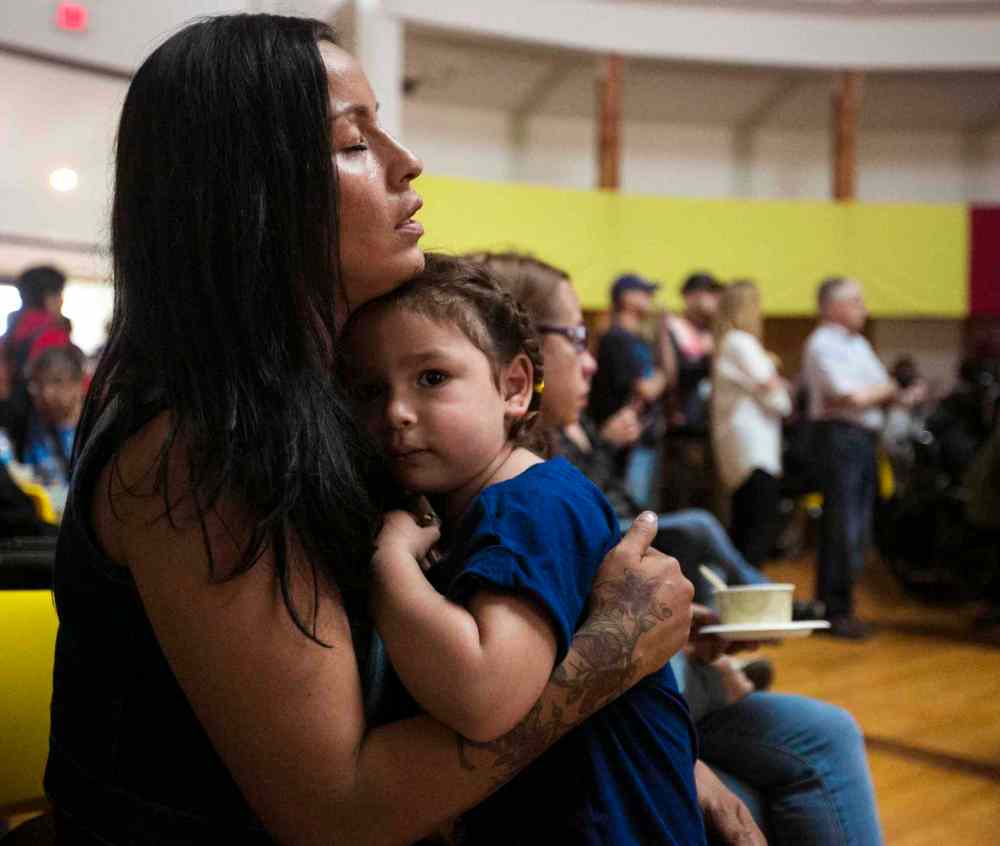 MIKAELA MACKENZIE / WINNIPEG FREE PRESS Charlotte Boubard holds her daughter, Toni, while singing at Winnipeg's Thunderbird House after the Walk for Reconciliation on Tuesday.