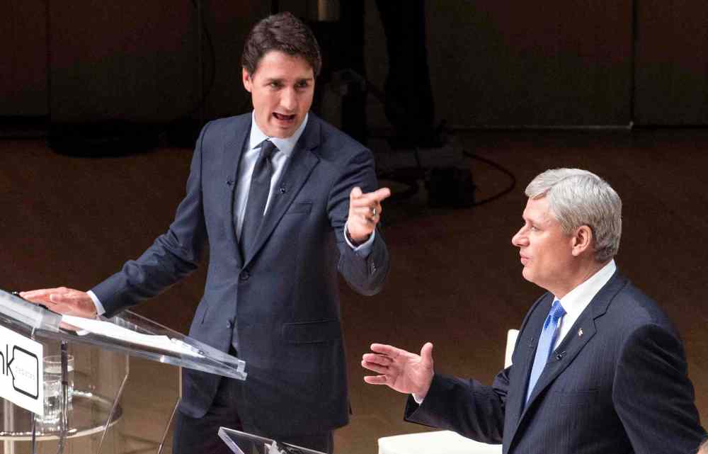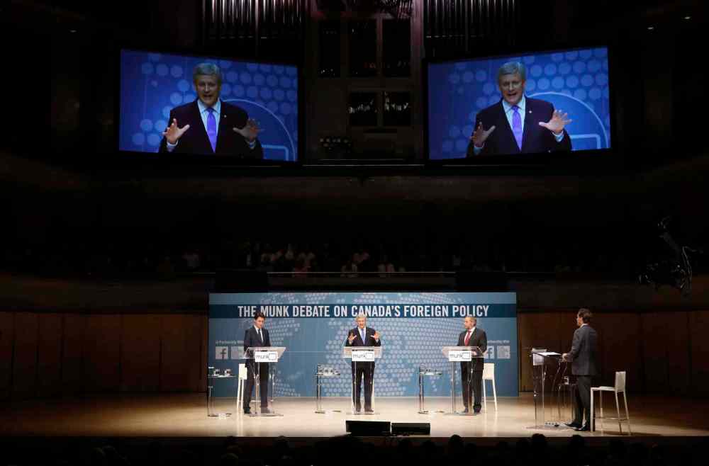 Liberal Leader Justin Trudeau, left to right, Conservative Leader and Prime Minister Stephen Harper and New Democratic Party Leader Thomas Mulcair participate in the Munk Debate on Canada's foreign policy in Toronto.