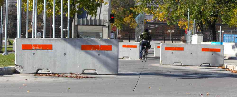 In the interim, the city plans to place wide concrete dividers known as Jersey barriers around the police headquarters on a temporary basis. These are the barriers commonly used to create roadblocks in war zones or block off highway lanes under construction.