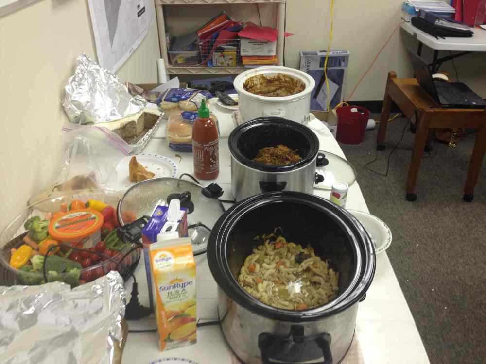What’s in the fridge: A bottle of white wine, sandwiches, soda drinks, salad and muffins. On the Friday night before Thanksgiving, they had a spread of hot food selections, including pulled pork, chicken pasta and a vegetable tray.