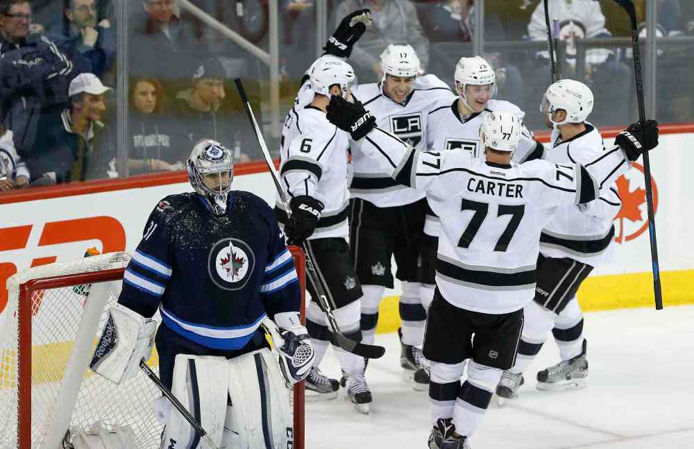 Los Angeles Kings' Jake Muzzin (6), Milan Lucic (17), Tyler Toffoli (73) Jeff Carter (77) and Alec Martinez (27) celebrate after Lucic scored the winning goal on Winnipeg Jets goaltender Ondrej Pavelec (31) during third period NHL action in Winnipeg on Tuesday.