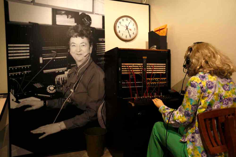 In a black-and-white photograph taking up a portion of the wall of the display, a dark-haired woman wearing a solid-coloured blouse sits in front of the same switchboard.