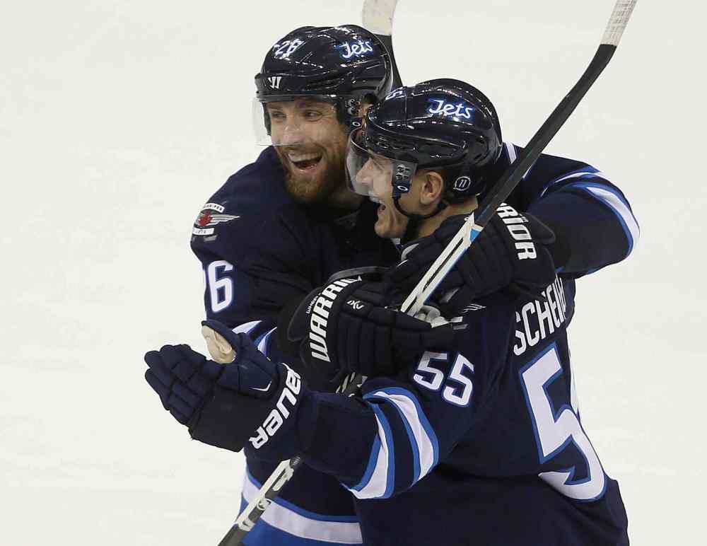 Winnipeg Jets' Blake Wheeler (26) and Mark Scheifele (55) celebrate after Scheifele scored a game winning goal in overtime against the Washington Capitals' in Winnipeg, Saturday, Dec. 5, 2015.