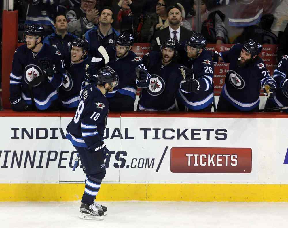Trevor Hagan / The Canadian Press The Winnipeg Jets' bench celebrates with Bryan Little (18) after he scored a penalty-shot goal against the Pittsburgh Penguins during first period.