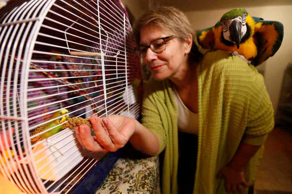 Shura has 11 other birds in her home, which move freely in and out of their cages during the day or ride on her shoulder like Kia, the 25-year-old blue-and-green macaw.