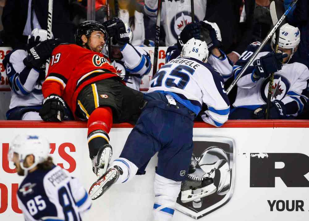 Winnipeg Jets' Mark Scheifele, right, checks Calgary Flames' David Jones into the Jets' bench during first period NHL hockey action in Calgary in December.
