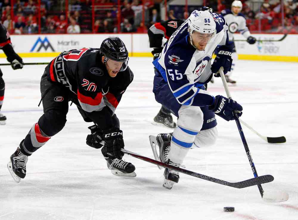 Carolina Hurricanes' Riley Nash (20) battles with Winnipeg Jets' Mark Scheifele (55) for the puck during the first period of an NHL hockey game, Tuesday, Feb. 16, 2016, in Raleigh, N.C. (AP Photo/Karl B DeBlaker)