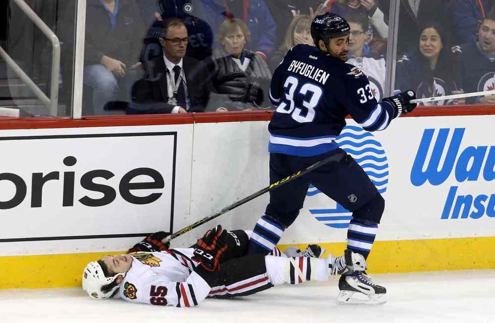 TREVOR HAGAN / WINNIPEG FREE PRESS Chicago Blackhawks' Andrew Shaw (65) is crushed by Winnipeg Jets' Dustin Byfuglien (33) during first period NHL hockey action, Friday, March 18, 2016.