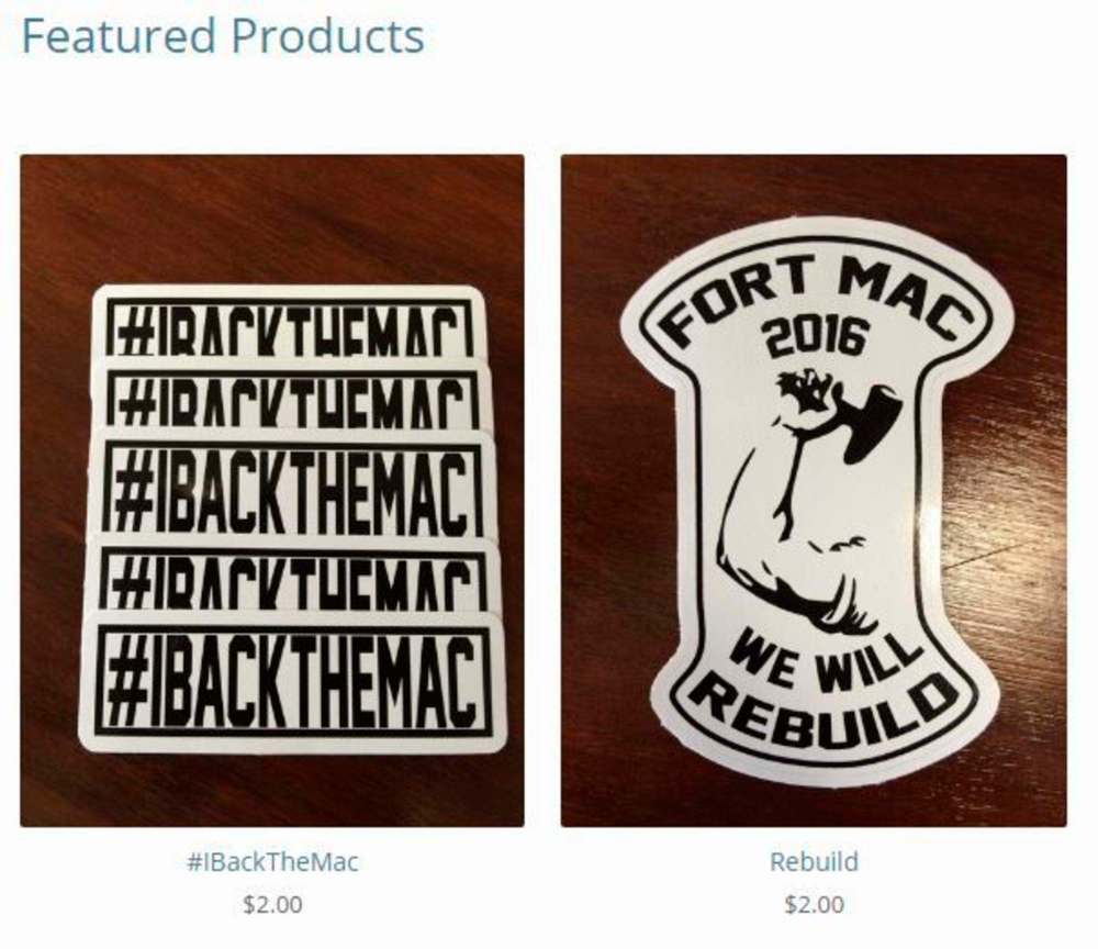 Two designs have already been set, and the first batch of stickers is on its way to Sleigh. One of the stickers is of a muscular arm, sleeve rolled up, swinging a hammer. It says: Fort Mac 2016: We Will Rebuild.