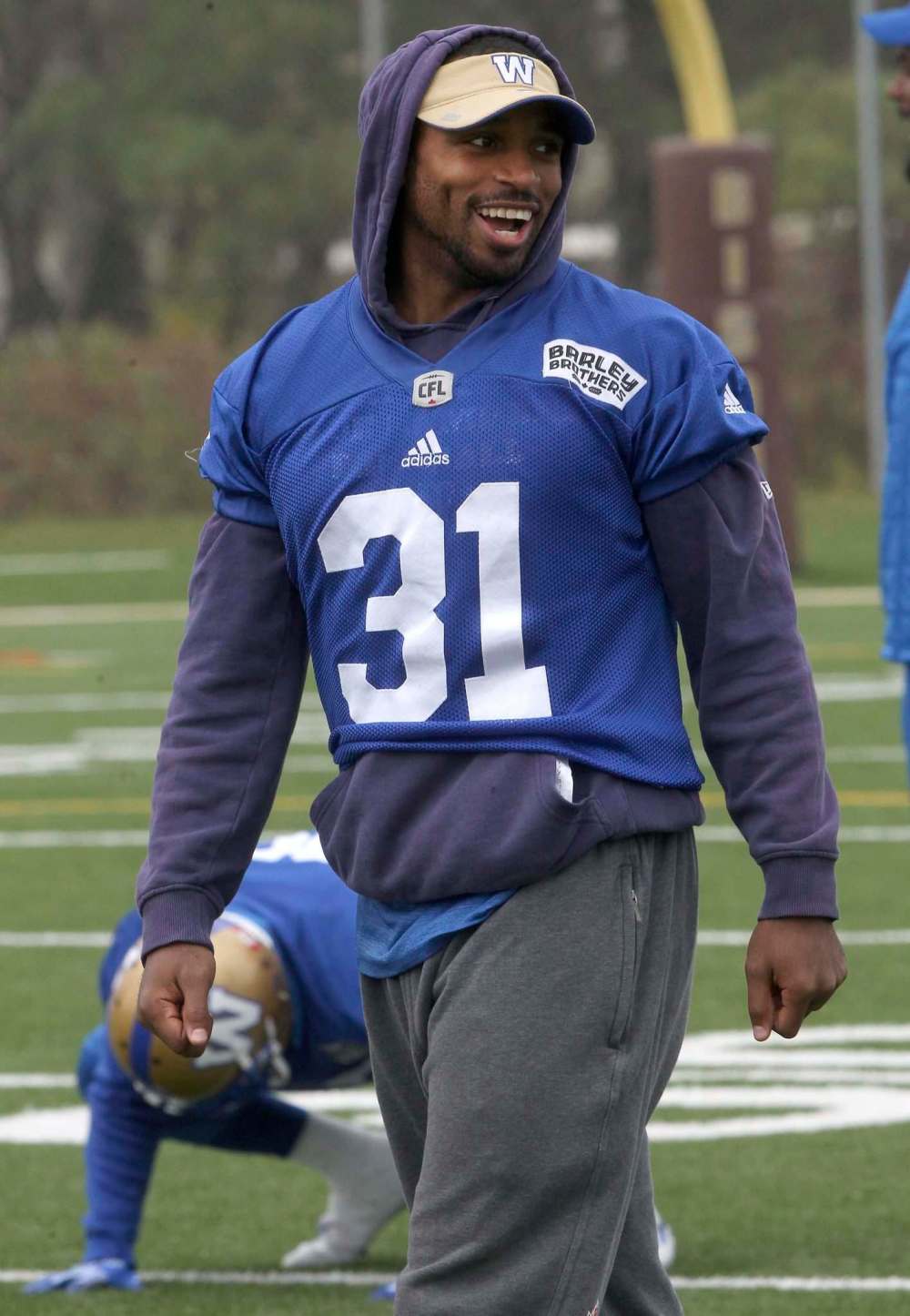 JOE BRYKSA / WINNIPEG FREE PRESSWinnipeg Blue Bombers Maurice Leggett does a light practice Tuesday at the University of Manitoba soccer pitch- Oct 11, 2016 -(See Scott’s story)
