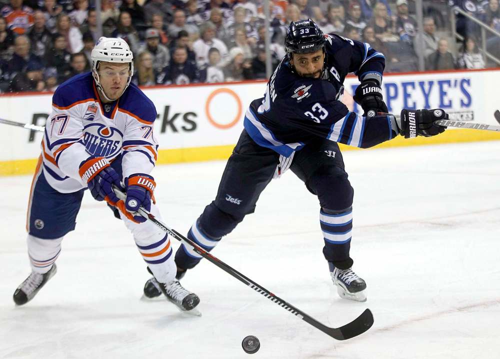 Winnipeg Jets Dustin Byfuglien and Edmonton Oilers Oscar Klefbom skate hard at the MTS Centre Thursday night.