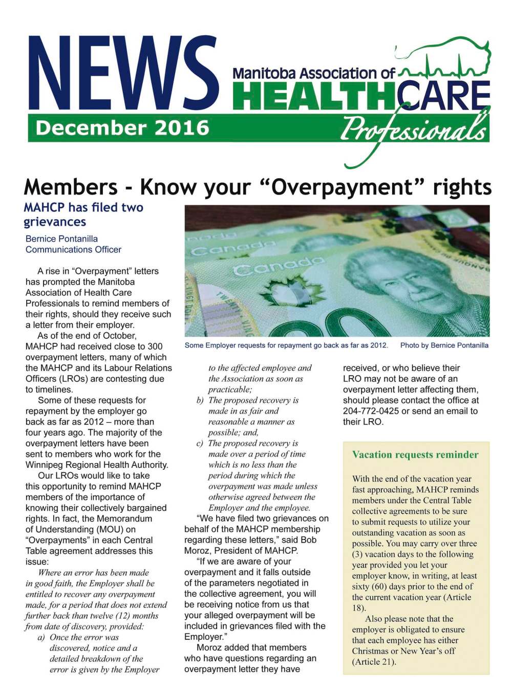The health-care professionals’ association outlined to its members in a newsletter in December that it had filed two grievances in the fall of 2016 over the 300 letters the WRHA had recently sent its members. It points to a provision in their collective bargaining that prohibits collecting money for overpayment if the overpayment is discovered more than a year after it occurred. The MGEU has the same provision.