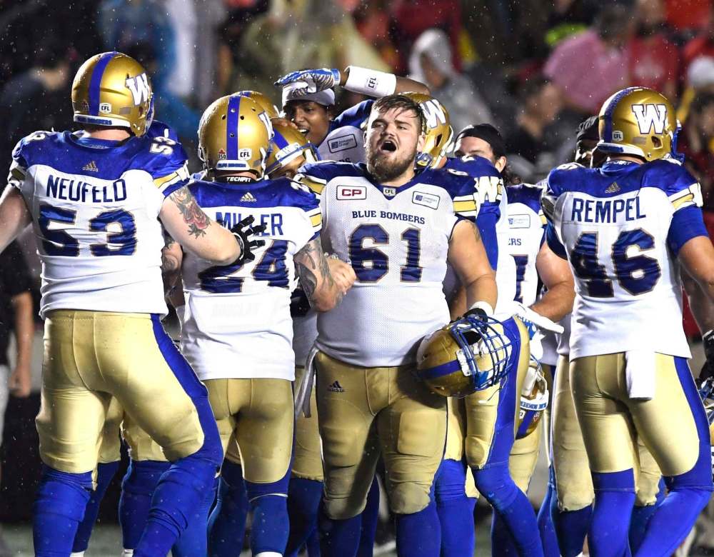 JUSTIN TANG / THE CANADIAN PRESS FILES Winnipeg Blue Bombers' Matthias Goossen (61) celebrates the team's game winning field goal against the Ottawa Redblacks during second half of a CFL football game in Ottawa on Friday, Aug. 4, 2017.