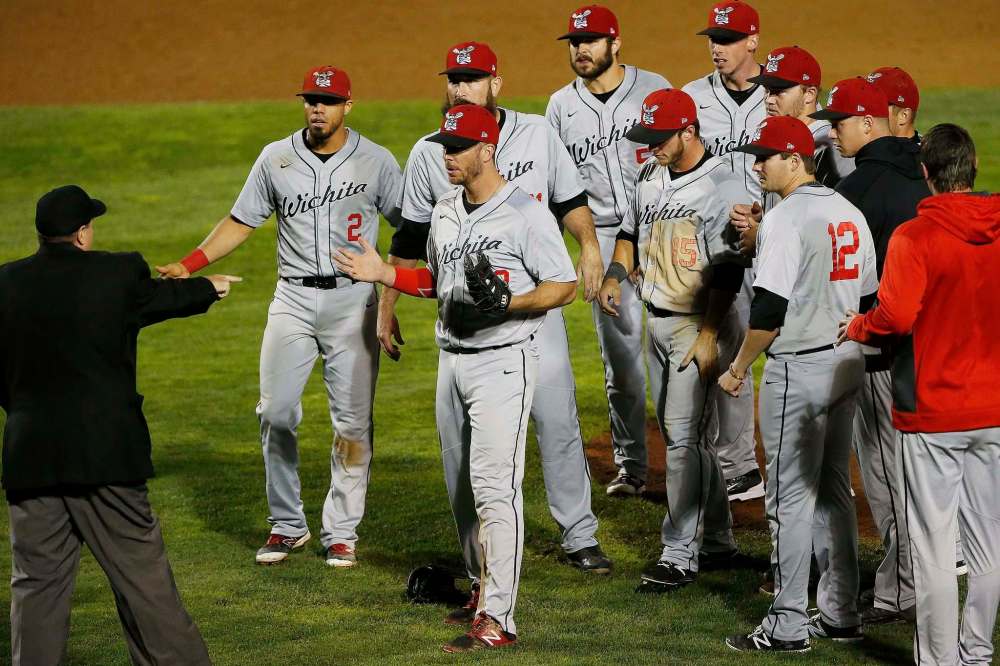 Wichita players and coaches came rushing out of the dugout to celebrate. They swarmed their pitcher, jumping and hugging and cheering. It was pure joy.