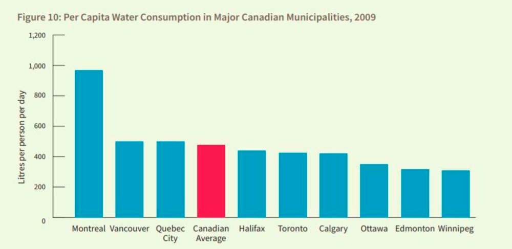 Overall water volume (per person, per day) produced by treatment plants in major Canadian cities.