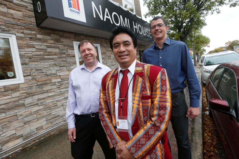 JOHN WOODS / WINNIPEG FREE PRESS Pastors of Naomi House and City Church Tim Nielsen, left and Indy Cungcin, centre with Director of Naomi House James Leschied at the facilities opening, Sunday.