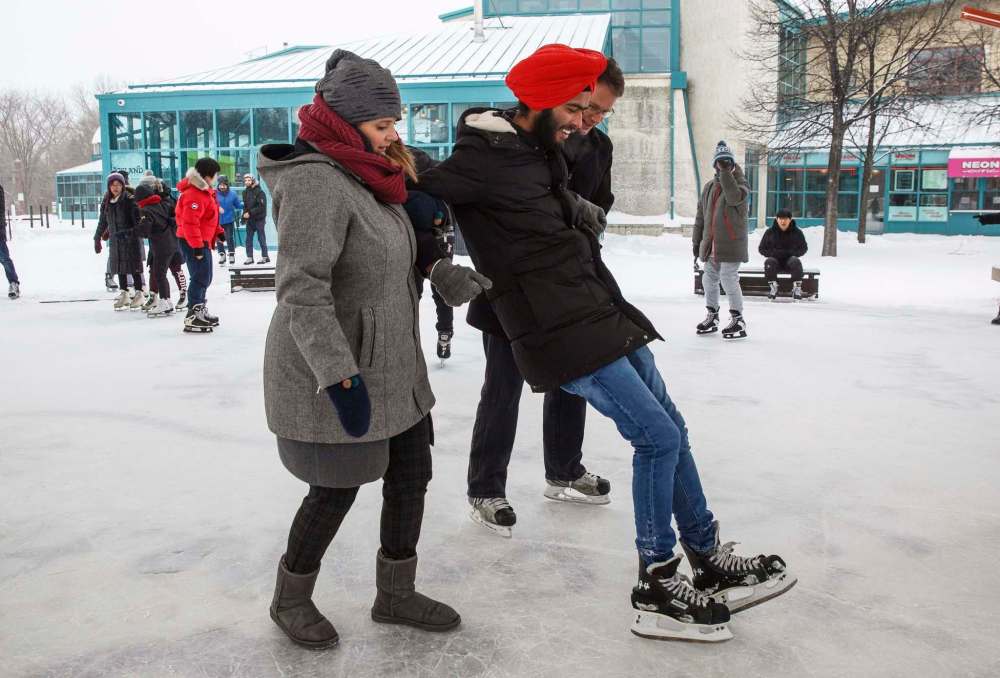 MIKE DEAL / WINNIPEG FREE PRESS Kerry Caldwell Korabelnikov (left), director of the Language Training Centre at RRC, and Paul Vogt (right), president and CEO at RRC, help first time skater Arshdeep Singh at The Forks, Friday, February 2, 2018.