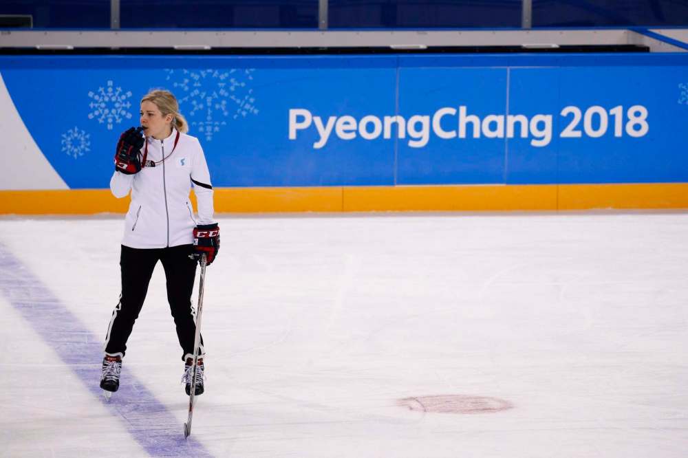 THE CANADIAN PRESS/AP/Jae C. Hong The joint Korean women's ice hockey team head coach Sarah Murray watches her players train prior to the 2018 Winter Olympics in Gangneung, South Korea, Monday, Feb. 5, 2018. Murray will occasionally find herself sounding like her hall of fame father while on the bench of South Korea's women's hockey team.