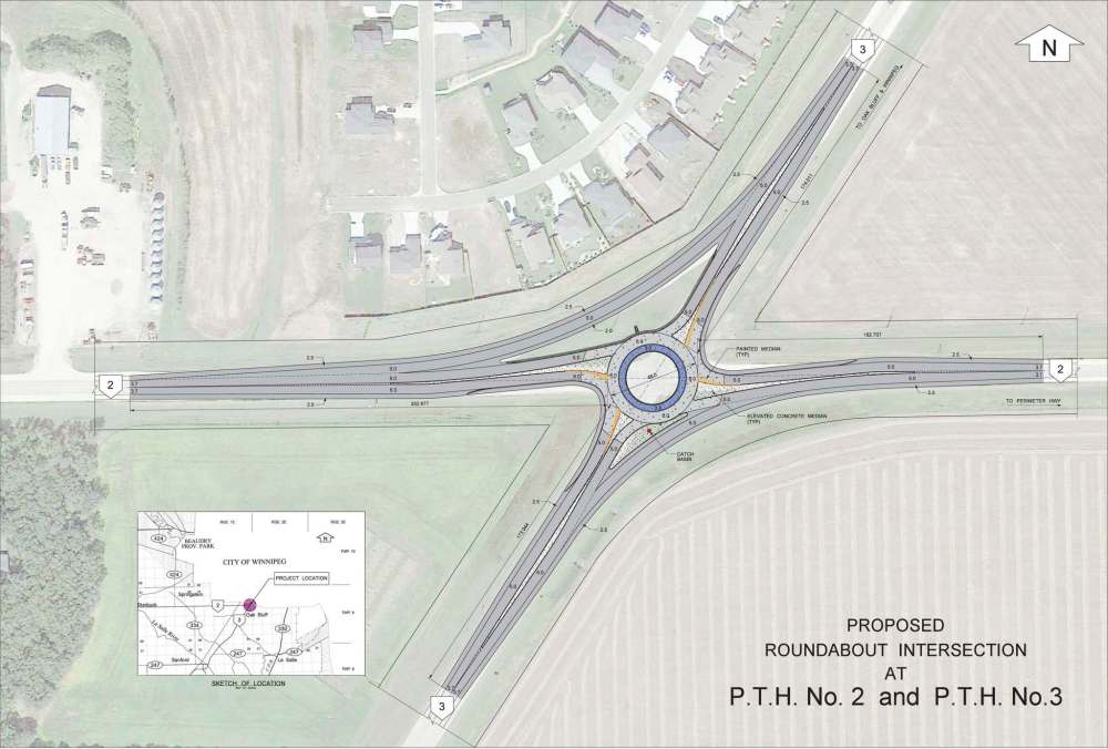 Infrastructure Minister Ron Schuler announced Thursday that the provincial government plans to build a roundabout at the intersection of highways 2 and 3, just south of Oak Bluff.