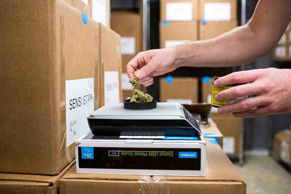Donnie Smith, assistant manager, weights out cannabis to put into jars for the sensory bar at the Delta 9 cannabis store in Winnipeg on Tuesday, Oct. 16, 2018.